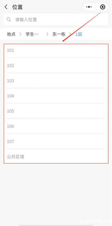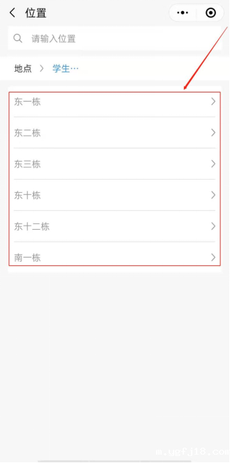 (1)点击位置-学生宿舍,选择需要报修的相应楼栋以及寝室号,如下图所示。